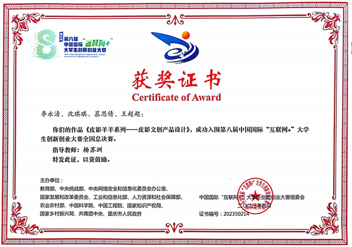 中國甘肅網(wǎng)7月12日訊(西北角·中國甘肅網(wǎng)記者 余守萱 通訊員 郭海霞)近日,從中國國際“互聯(lián)網(wǎng)+”大學(xué)生創(chuàng)新創(chuàng)業(yè)大賽組委會傳出喜訊,由環(huán)縣第二中學(xué)楊蘇洲老師指導(dǎo),學(xué)生李永清、沈琪琪、慕思倩、王超超四人共同創(chuàng)作完成的作品《皮影羊羊系列——皮影文創(chuàng)產(chǎn)品設(shè)計》,成功入圍第八屆中國國際“互聯(lián)網(wǎng)+”大學(xué)生創(chuàng)新創(chuàng)業(yè)大賽全國總決賽。