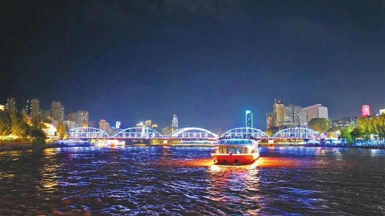 夜幕降臨,黃河兩岸璀璨霓虹逐一亮起,蘭州白塔山碼頭游船售票處、登船安檢處排起了數(shù)十米的長隊,“金城壹號”“悠游蘭州號”“墨跡號”等十多艘游輪載著南來北往的游客穿梭于黃河之上,為夜晚的黃河之濱添了一抹流動的色彩。