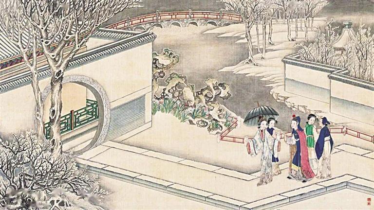 著名紅學(xué)家周汝昌曾評(píng)論清代孫溫《紅樓夢(mèng)》繪本是“紅樓瑰寶”,其中一處細(xì)節(jié)就配得上這種評(píng)論。賈政攜寶玉和眾客游覽大觀園的繪制中,孫溫用了13幅畫并以焦點(diǎn)游移的手法,一路將賈政等人的路線詳細(xì)描繪出來,跟著畫面而走,觀者可以看到瀟湘館、蘅蕪院、沁芳亭、沁芳橋等大觀園景觀,令人嘆為觀止。