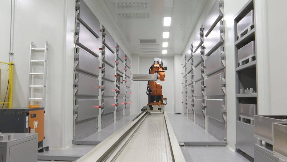 在一家企業(yè)的干燥車(chē)間內(nèi),六軸機(jī)器人正在搬運(yùn)成品電池。(受訪(fǎng)單位供圖)