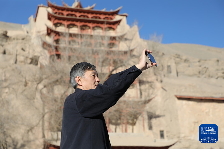 2022年2月23日 敦煌研究院院長蘇伯民正在用手機(jī)進(jìn)行“數(shù)字敦煌”體驗。新華每日電訊記者 張睿 攝