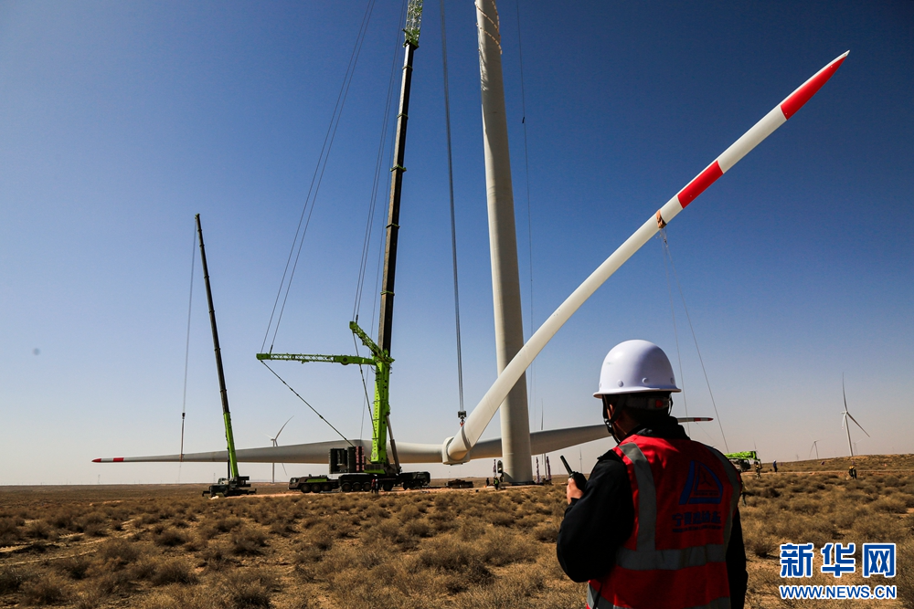近日,在甘肅省張掖市甘州區(qū)平山湖20千瓦風(fēng)電施工現(xiàn)場(chǎng),工人們緊張有序地進(jìn)行風(fēng)電設(shè)備安裝工作。新華網(wǎng)發(fā)(陳禮 攝)