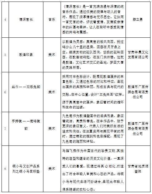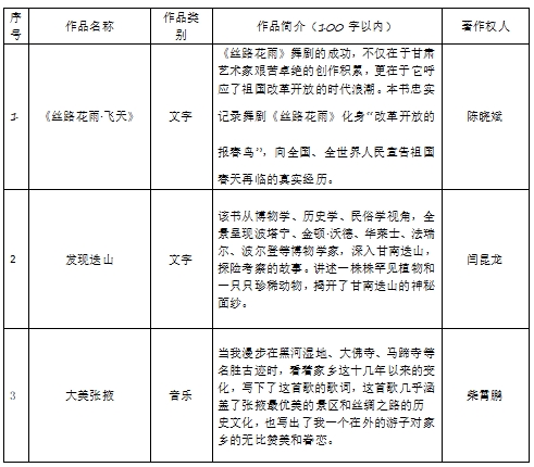 2024年6月,甘肅版權(quán)綜合服務(wù)平臺(tái)共完成省內(nèi)作品登記804件,其中文字作品235件、美術(shù)作品469件、攝影作品9件、音樂作品39件、視聽作品20件、口述作品8件、其他作品24件。經(jīng)認(rèn)真組織篩選,并經(jīng)著作權(quán)人同意,現(xiàn)公開推薦以下10件優(yōu)秀作品,歡迎社會(huì)各界交流合作。(聯(lián)系方式:0931-8270727)