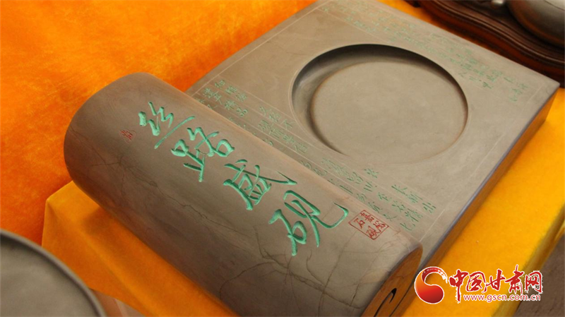 嘉峪石硯,取材于嘉峪山后的黑山峽深處,故又稱“黑山石硯”,是目前所知最早的古石硯之一。這種石硯質(zhì)堅(jiān)而細(xì)、扣之有聲,發(fā)墨快而不損毫,儲(chǔ)墨久而不干,“有史記載的三百多種石硯中,只有嘉峪石硯是帶有銘文出土的。這對(duì)于石硯的研究具有重要的史料價(jià)值。”劉宗學(xué)向?qū)嵺`團(tuán)成員系統(tǒng)地講述了嘉峪石硯的傳承歷史,并展示了自己以絲綢之路為主題創(chuàng)作的“絲路盛硯”組合石硯。這套石硯主要以甘肅十四個(gè)地州市的建筑、景觀、歷史人物為內(nèi)容,體現(xiàn)了甘肅省的根脈文化、黃河文化、長(zhǎng)城文化、絲路文化、紅色文化等五大文化,表現(xiàn)出甘肅在絲綢之路經(jīng)濟(jì)發(fā)展與文化交流中的重要作用。
