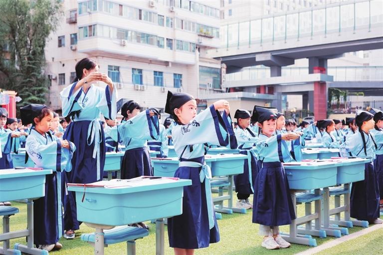 中國甘肅網(wǎng)9月2日訊 據(jù)蘭州晨報報道(奔流新聞·蘭州晨報記者裴強(qiáng)) 8月30日,蘭州市七里河教育集團(tuán)為七里河小學(xué)和中車分校的600名一年級新生舉行入學(xué)“開筆禮”儀式。開筆禮在中國傳統(tǒng)文化中是對少兒識字習(xí)禮的稱謂,是標(biāo)志少兒進(jìn)入學(xué)習(xí)階段的重要紀(jì)念,是中國古代人生的首次大禮,孩子將要入學(xué)讀書寫字、習(xí)禮之時的一個傳統(tǒng)禮節(jié)。兩所學(xué)校600名一年級新生“端正衣冠”“感恩先賢”“朱砂啟智”“擊鼓鳴志”“啟蒙描紅”,體驗傳統(tǒng)“開筆禮”儀式。