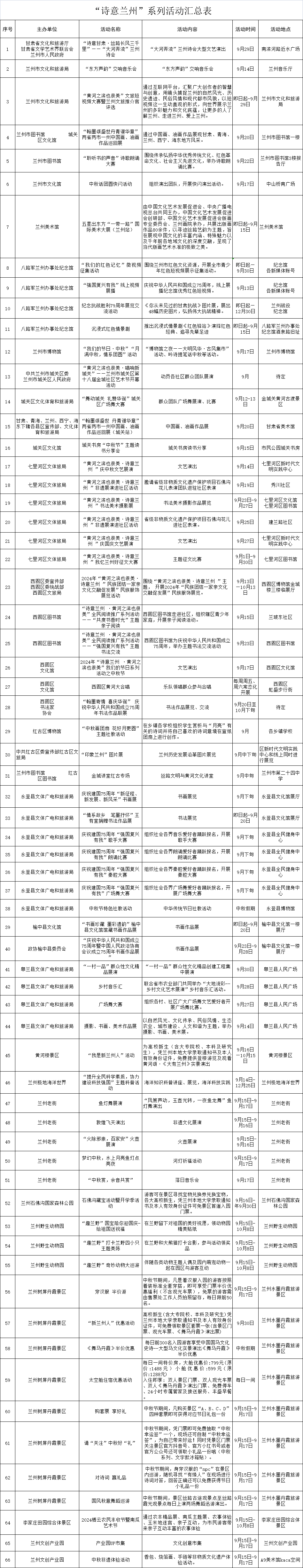 中國(guó)甘肅網(wǎng)9月14日訊(西北角·中國(guó)甘肅網(wǎng)記者 沈文剛)為預(yù)熱“大河奔流”蘭州詩(shī)會(huì)、豐富中秋假期文旅產(chǎn)品供給,蘭州市文旅局即日起至9月30日,推出“黃河之濱也很美·詩(shī)意蘭州”系列66項(xiàng)文旅活動(dòng),立足文化賦能旅游體驗(yàn),做優(yōu)產(chǎn)業(yè)、做實(shí)消費(fèi),為市民游客精心打造一場(chǎng)文旅服務(wù)盛宴。