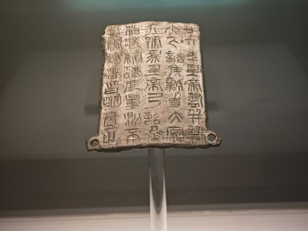 “鎮(zhèn)原縣博物館的鎮(zhèn)館之寶是秦二十六年銅詔版,1976年 4月 1日被鎮(zhèn)原縣城關(guān)鎮(zhèn)富坪村建宅取土的農(nóng)民發(fā)現(xiàn)并上交。在1996年 9月,國(guó)家文物局鑒定專家組定為國(guó)家一級(jí)文物。這塊銅詔版上有文字5 行,共40字,字跡清晰,線條纖細(xì),字體為小篆。在用筆結(jié)構(gòu)上既有秦代小篆規(guī)矩整飭的風(fēng)范,又保留著大篆文字的某些特點(diǎn)。”鎮(zhèn)遠(yuǎn)縣博物館講解員介紹道。