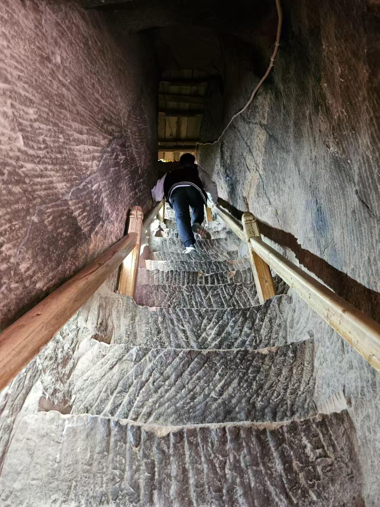 由第一層的北邊入內,隧道呈“之”字形,回廊曲折。里邊只能容納一個人行走,兩個人并坐,一共上去有129個臺階。石窟中的石砌臺階百轉千回,高低不一,不少階梯需要手腳并用才能上去,其艱難程度激發(fā)了游客的攀登欲,也有了“不到長城非好漢,不登三十三天真遺憾”的說法。