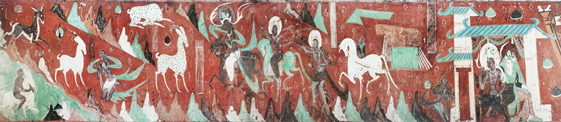 這幅壁畫在藝術(shù)風(fēng)格上獨(dú)樹一幟,深受中原繪畫形式的影響。它既摒棄了印度壁畫的環(huán)形構(gòu)圖方式,又不同于龜茲壁畫里的菱形畫面布局,而是開創(chuàng)性地采用了連環(huán)畫式的長卷式構(gòu)圖,宛如一條歷史的長河,將故事娓娓道來。
