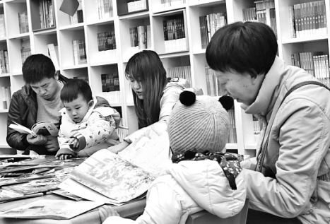 1月5日,在甘肅省天水市麥積區(qū)新華書(shū)店,孩子們?cè)诩胰说呐惆橄卤M享閱讀的喜悅和愜意,以閱讀方式度過(guò)新年的首個(gè)周末。