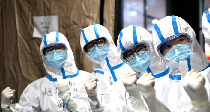 圖為武漢醫(yī)護人員在進入病區(qū)前加油鼓勁 安源 攝