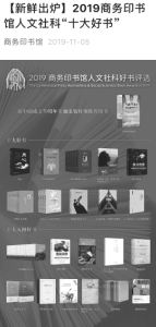 “商務(wù)印書館人文社科好書評選”被中央電視臺等媒體稱為“年度圖書榜單風(fēng)向標(biāo)”。每每公布后,央媒及主流媒體都會予以報(bào)道,同時(shí)在新媒體平臺也會進(jìn)行系列宣傳,比如2019年的好書評選人民日報(bào)官方微信發(fā)布后一天內(nèi)的閱讀量便超過了888萬。