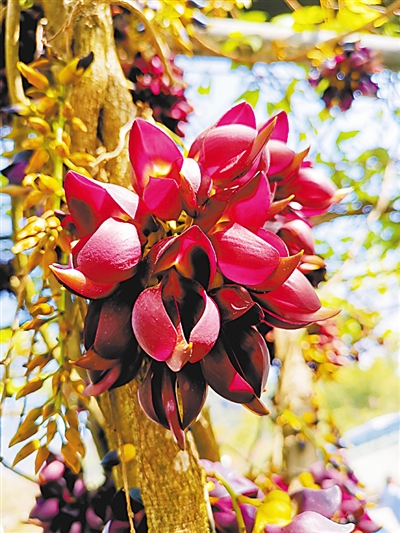我終于登上山巔,來到那個(gè)罕見的常春油麻藤家族旁邊,眼前的景象,比我想象的更震撼。傷痕累累的蒼勁老藤猶如飛龍騰空而起,盤旋而上。只是,眼前的飛龍,是一條掛滿鮮花的飛龍。成千上萬的花朵,密密麻麻包裹著幾根老藤,每一朵,都像是紫色的飛鳥。這些花不是同時(shí)開放的:最早的已經(jīng)掉在地上,就像一群小鳥落地休息;更晚的還沒有吐出花蕊,像是巢中幼鳥,還在閉眼做夢;數(shù)量最多的,正迎風(fēng)怒放,雖然是陰天,但透進(jìn)樹林的弱光,讓它們格外明亮。