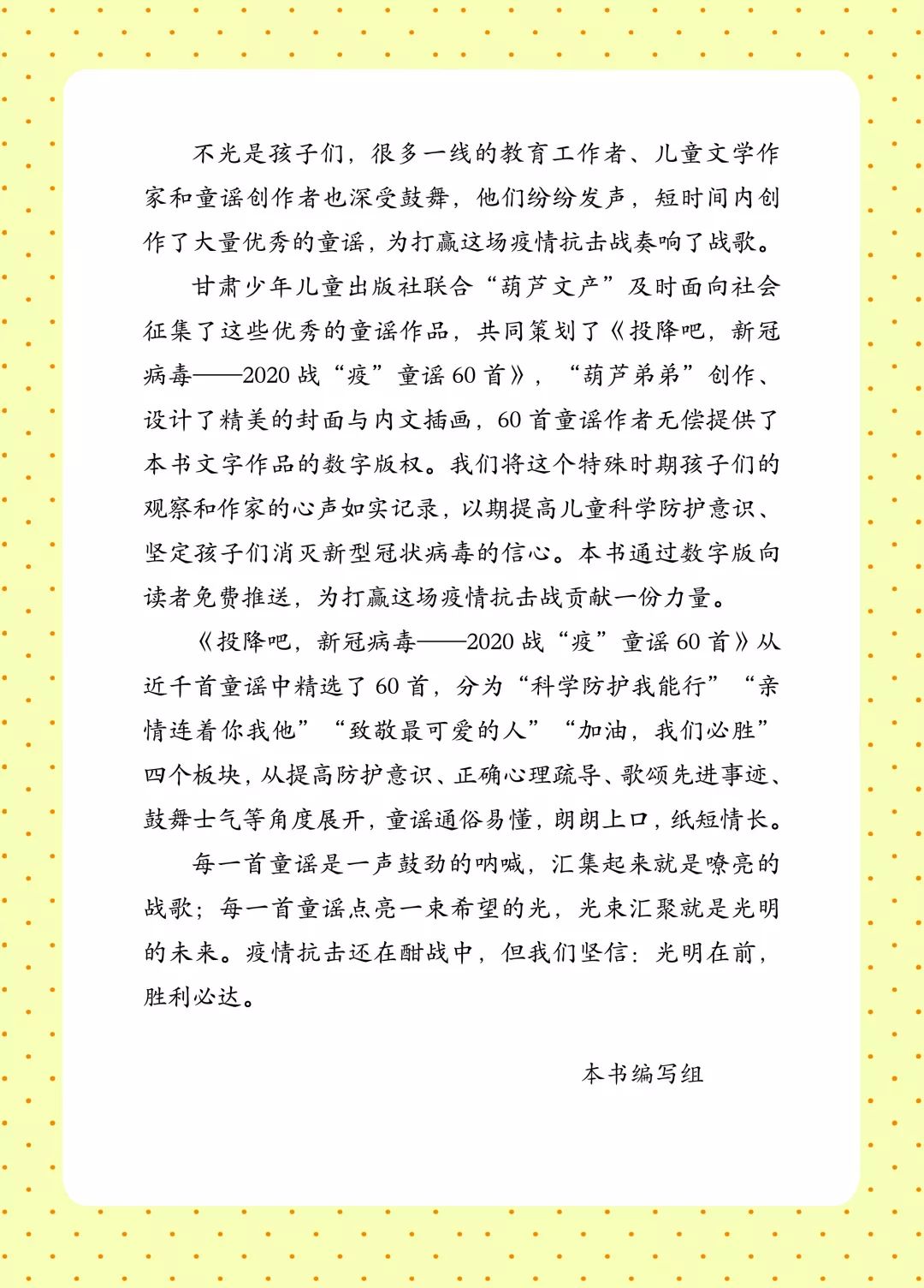 以下為《投降吧,新冠病毒——2020戰(zhàn)“疫”童謠60首》一書全部內(nèi)容: