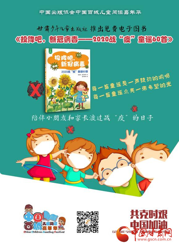 庚子之春,新冠肺炎疫情爆發(fā),全國人民奮力投身到這場疫情防控阻擊戰(zhàn)中,孩子們、兒童文學(xué)作家也紛紛創(chuàng)作了大量優(yōu)秀的童謠。2月份,讀者出版集團旗下甘肅少年兒童出版社(以下簡稱:甘肅少兒社),策劃上線了免費公益數(shù)字出版物《投降吧,新冠病毒——2020戰(zhàn)“疫”童謠60首》。書中收錄60首優(yōu)秀童謠作品,對兒童進行防疫科普宣傳,以期提高兒童科學(xué)防護意識和戰(zhàn)勝病毒的信心。一首首童謠匯集起來,架起了孩子和家長共同抗疫的橋梁,也點亮了孩子們用稚嫩的眼光和思維認識這場災(zāi)難的微光。