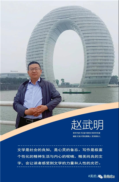 懷瑾握瑜,勤耕不輟。趙武明的寫作是安靜的,由于從事20余年的新聞工作,給他貯存了很多素材,所以他涉獵的寫作范疇很廣,寫散文隨筆、文藝評論、紀(jì)錄片、微電影、大型晚會總撰稿,還研究網(wǎng)絡(luò)文學(xué)。如果說文字是會呼吸的,趙武明的文字除了唯美,更多的是硬骨錚錚,也不乏柔腸的峻厲和倬約,風(fēng)姿獨(dú)具,淡雅濃烈,相得益彰,簡約獨(dú)立,一語千里,蘊(yùn)含張力。他常說,寫作要穿透人心抵達(dá)靈魂。向外,不斷追求生命更高的境界;向內(nèi),不斷觸及心靈。