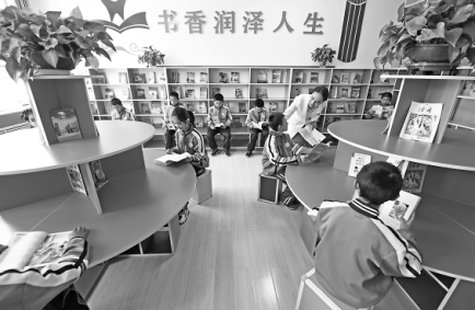 圖為5月12日,在吹麻灘小學(xué)圖書室,董彩云(后排右二)和正在閱讀的學(xué)生交流。