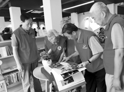 社區(qū)退休黨員在“紅旗書屋”里翻看大型圖冊(cè)《中國》。