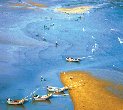 功夫不負(fù)有心人。經(jīng)過漫山遍野地毯式的尋覓,鄭德雄一行把霞浦海灘的拍攝點(diǎn)摸了個(gè)遍,也拍出了一幅幅漂亮的好作品。那照片上的霞浦真是美啊:藍(lán)色的海水,金色的沙灘,種海帶的竹竿依序林立,滿載的漁船停泊在靜靜的港灣,趕海人背著沉甸甸的魚簍,正走在金色的沙灘上……