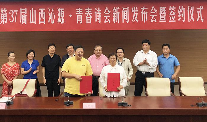 沁源縣委書記金所軍介紹沁源縣盛產(chǎn)油松、褐馬雞,村村有秧歌隊(duì)和籃球場(chǎng),有山有水,美麗又美好。他將作為“全國(guó)森林旅游示范縣”的沁源縣詩意概括為“三晉大地的香格里拉”“近在咫尺的桃花源”。沁源縣委宣傳部部長(zhǎng)黃貴河對(duì)沁源縣的文學(xué)創(chuàng)作情況及第37屆“青春詩會(huì)”活動(dòng)承辦設(shè)想進(jìn)行了介紹。發(fā)布會(huì)結(jié)束后,沁源縣政府副縣長(zhǎng)李建萍與《詩刊》事業(yè)發(fā)展部副主任藍(lán)野簽定了合作協(xié)議。