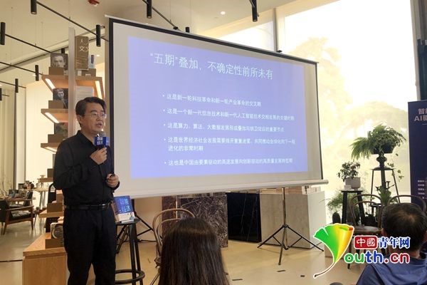 《智能經(jīng)濟(jì)》新書研討會(huì)上,張曉峰在進(jìn)行主題演講。中國青年網(wǎng)記者 張?jiān)姮?nbsp;攝