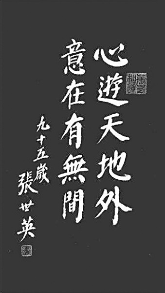 張先生的人生是圓滿的。趙樸初《遺囑》說:“生固欣然,死亦無憾?;溥€開,水流不斷。我兮何有,誰歟安息?明月清風(fēng),不勞尋覓。”弘一法師《辭世二偈》之二說:“華枝春滿,天心月圓。”這些遺言,都顯示了一種人生圓滿的喜悅。張先生書法集中的兩句話:“心游天地外,意在有無間。”同樣顯示了一種人生圓滿的喜悅。
