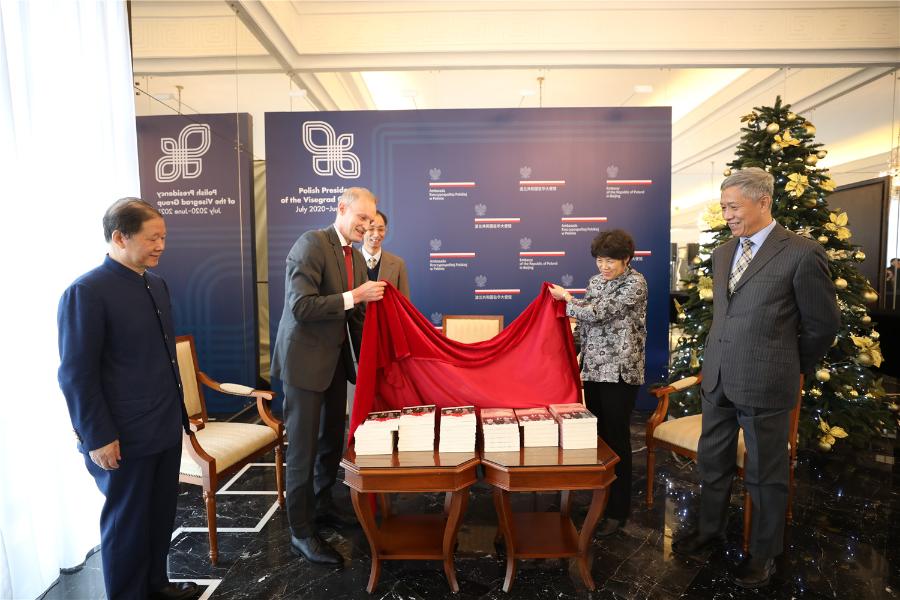 波蘭駐華大使賽熙軍(左二)和五洲傳播出版社副社長荊孝敏(右二)為新書揭幕。五洲傳播出版社供圖