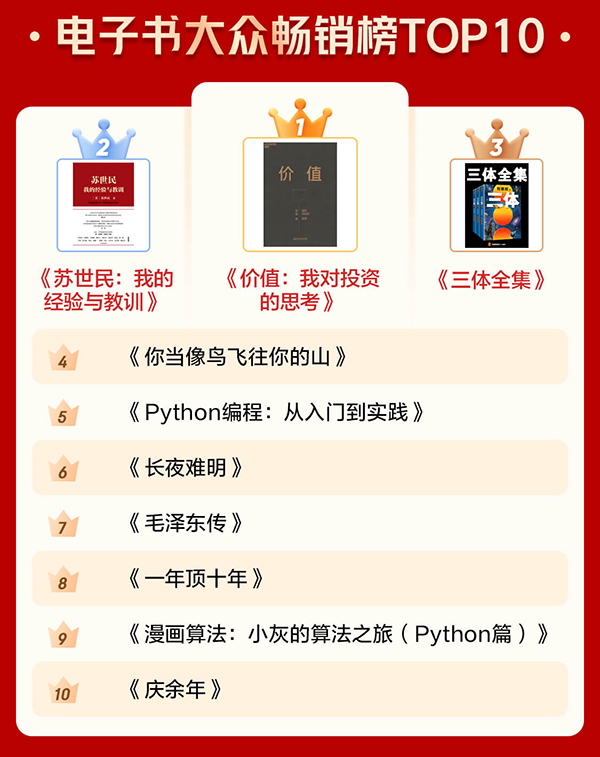 通過(guò)電子書暢銷榜TOP10和有聲暢銷榜TOP10可以看出,很多人愈發(fā)關(guān)注投資和管理等方面的內(nèi)容,也愈發(fā)注重個(gè)人學(xué)習(xí)?!秲r(jià)值:我對(duì)投資的思考》《蘇世民:我的經(jīng)驗(yàn)與教訓(xùn)》 分別位居電子書暢銷榜第一名和第二名?!吨袊?guó)經(jīng)濟(jì)2020》《原則》進(jìn)入有聲暢銷榜前十。此外,學(xué)習(xí)類圖書《Python編程:從入門到實(shí)踐》《漫畫算法:小灰的算法之旅(Python篇)》也上榜電子書暢銷榜前十。