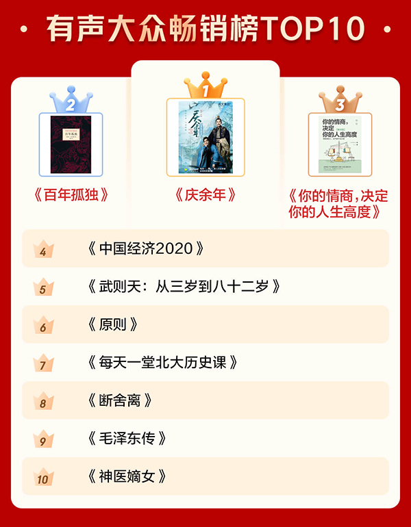 隨著大IP改編影視劇的熱度逐年升高,影視劇原著小說(shuō)也越來(lái)越成為數(shù)字閱讀中最暢銷的書籍類型。其中,《慶余年》隨著電視劇的火爆和《慶余年2》原班人馬即將開拍帶來(lái)的熱議流量,其原著小說(shuō)入圍電子書暢銷榜TOP10和有聲書暢銷榜TOP10;改編為《沉默的真相》的紫金陳原著小說(shuō)《長(zhǎng)夜難明》則位列電子書暢銷榜第6名。