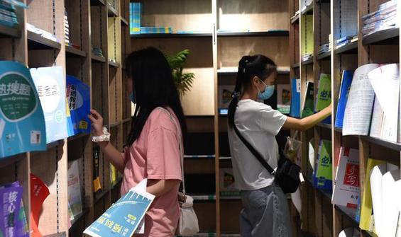 資料圖:圖為學(xué)生在書(shū)店里挑選練習(xí)題。 周毅 攝