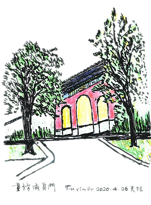 書已寫罷,小寒節(jié)氣過(guò)后,我又多次去天壇,不為寫作,只是習(xí)慣,仿佛腳步慣性,去天壇轉(zhuǎn)轉(zhuǎn),就會(huì)感覺(jué)充實(shí)一些。2020年1月20日正值大寒節(jié)氣,那天下午,我從圜丘到成貞門西北側(cè),那里并排有兩把座椅,我坐在座椅上畫成貞門。春節(jié)將近,除了工人在懸掛紅燈籠、安裝慶祝春節(jié)的展牌,天壇里的游人并不多。我和很多游人一樣,不知道,或者說(shuō)不敏感,一場(chǎng)疫情正如餓虎撲食那樣向我們迫近。
