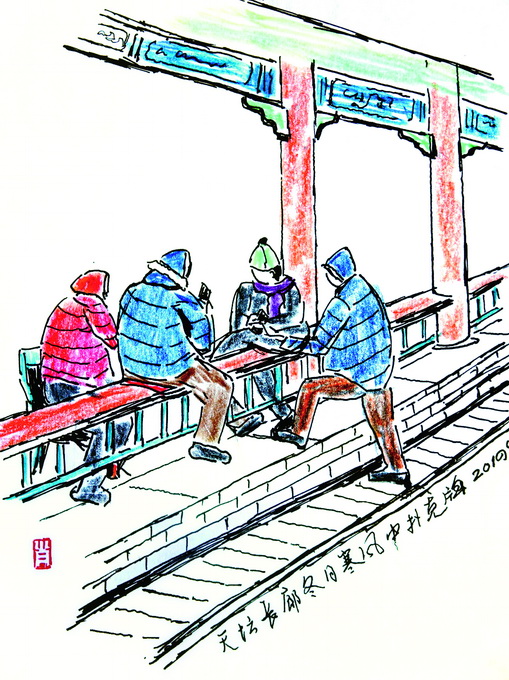 童年時(shí),我家離天壇很近,即便是現(xiàn)在的住所,離天壇也不算遠(yuǎn),地利之便,使我和天壇有種天生的緣分。這種緣分不是一見(jiàn)鐘情,而像長(zhǎng)時(shí)間接觸磨出來(lái)的老繭,結(jié)實(shí)且持久。幾十年來(lái),天壇是我最常去的公園,最近幾年迷上畫畫,更要去那里畫速寫。由于畫畫,身邊總會(huì)站著幾個(gè)看畫的人,無(wú)論褒貶,一定得聊上幾句。以前有人看我畫畫,我老覺(jué)得不自在,后來(lái)臉皮不僅變厚了,心里還冒出個(gè)念頭:如果天天到這里畫畫,可以接觸到好多人,隨手記下各色人等的人生百態(tài),這不是挺有意思的嗎?
