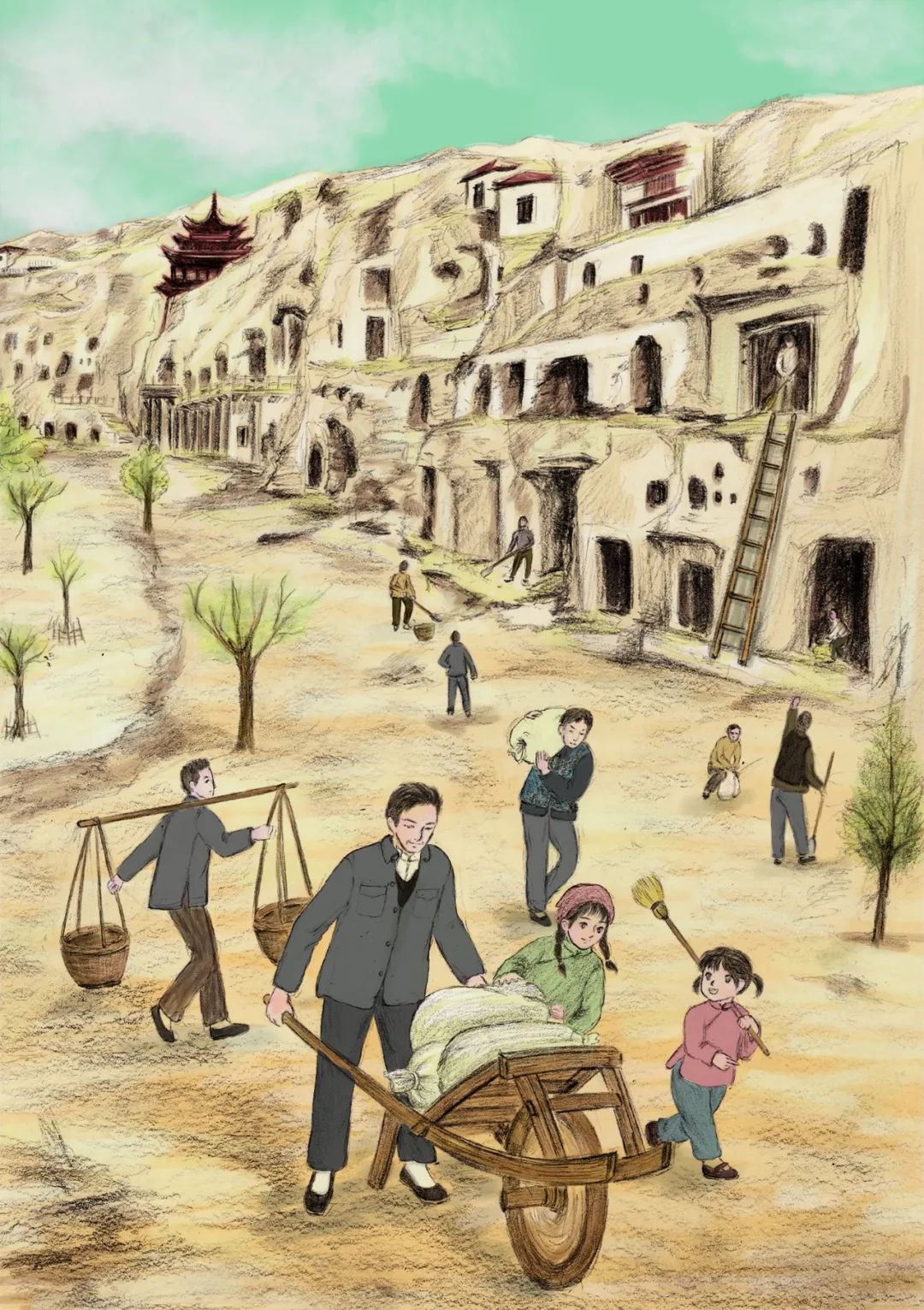 《敦煌小畫師》的故事,以民國時候國立敦煌研究所初創(chuàng)時期為背景,以一個小女孩欣潔的眼光,摹刻了一群以敦煌為文化藝術(shù)圣地而奮斗而獻身的藝術(shù)家和學者群體,這個群體以欣潔的父親為代表,他們舍棄溫暖濕潤的家鄉(xiāng),而遠赴那個遙遠荒涼的所在。因為那里有敦煌,因為那里保存著一千多年前的珍貴文物和彩塑壁畫,還因為那里急需有人來保護、修復(fù)和弘揚。他們來了,他們在這片戈壁之地安家扎根,在動蕩的社會時局下開始了為家為國的擔當,也開始了人生理想和價值的實現(xiàn)。這一切,以一個孩子的眼光來看,幾乎就是交織著欣喜和失望、歡喜與憂愁,從茫然無知到誠摯熱愛的一段生動故事?!抖鼗托‘嫀煛饭适虑楣?jié)的設(shè)定,有起伏有高潮,有親情之愛,有田野之趣,更有人與人之間和諧相助的人性之美,讀起來有聽一首鄉(xiāng)村音樂的韻律感。我覺得,一部優(yōu)秀的兒童文學作品,應(yīng)該就是這個樣子。