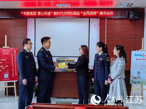 連云港航標(biāo)處向墟溝街道桃園社區(qū)捐贈(zèng)圖書。張晗攝