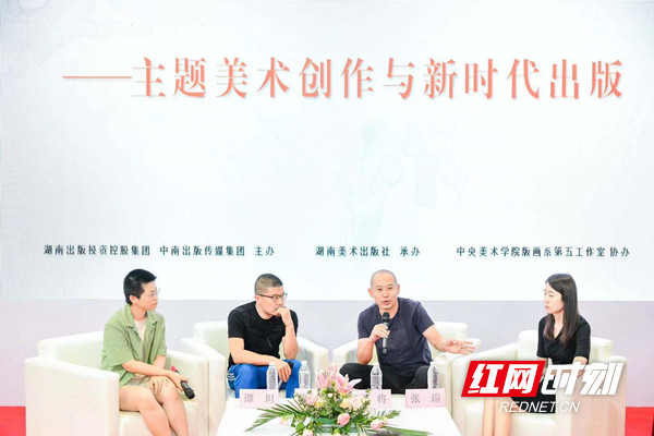 活動現(xiàn)場,康劍飛、武將、《少年毛澤東》項目藝術(shù)指導(dǎo)譚坦、《少年毛澤東》項目執(zhí)行張瑄等四位嘉賓,圍繞主題美術(shù)創(chuàng)作與主題出版、插圖與繪本演變、版畫的發(fā)展與傳播特點等議題展開討論,并結(jié)合湖南美術(shù)出版社即將出版的《少年毛澤東》,分享了創(chuàng)作心得,還與現(xiàn)場的讀者進(jìn)行了互動交流。