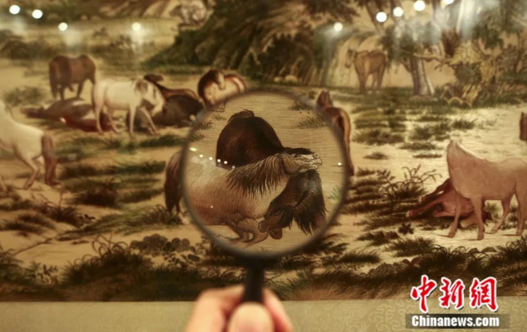 觀眾用放大鏡觀看以郎世寧《百駿圖》為藍(lán)本的蘇繡作品。中新社記者 張浩 攝