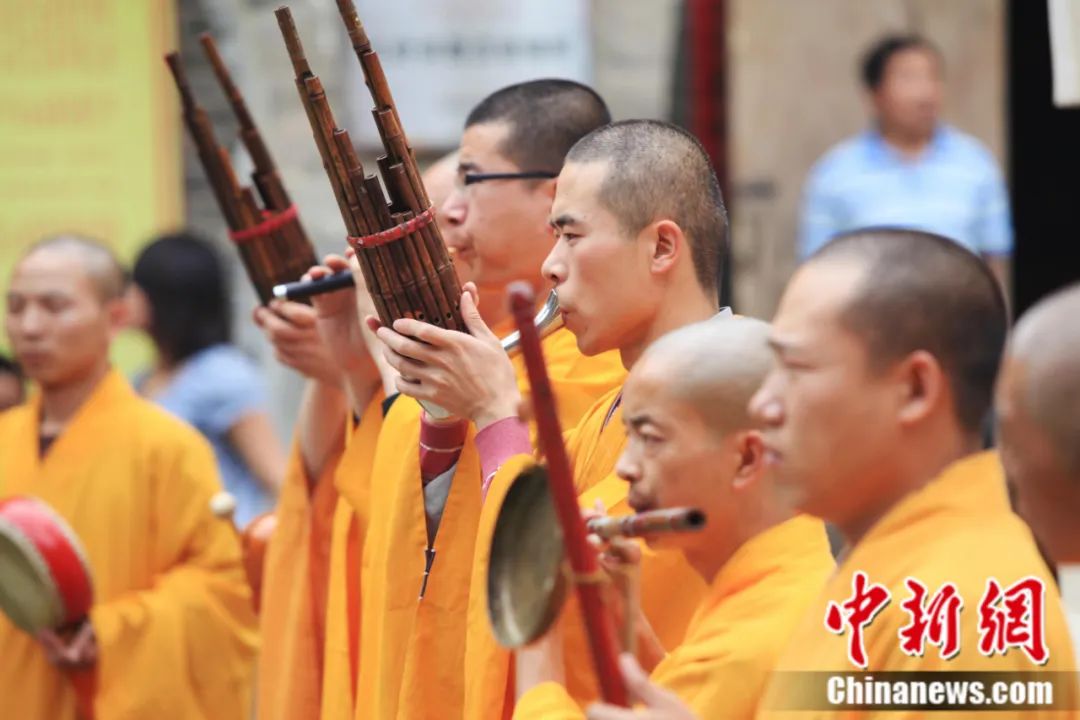 2011年7月,在山西五臺山南山禪寺,僧人演奏漢傳佛樂。中新社記者 韋亮 攝