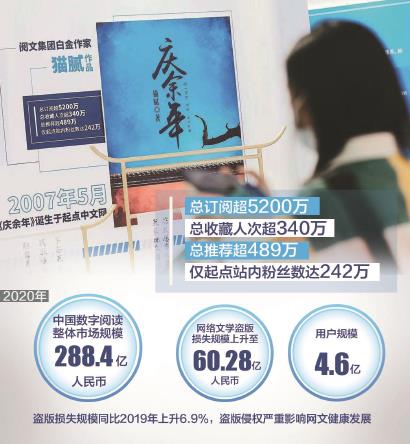有數(shù)據(jù)顯示,2020年中國網(wǎng)絡文學市場規(guī)模為288.4億元,網(wǎng)絡文學通過IP全版權運營間接或直接影響了動漫、音樂、影視、游戲等合計約2531億元的市場,對數(shù)字文化產(chǎn)業(yè)的影響范圍超過40%。但令人痛心的是,2020年中國網(wǎng)絡文學盜版損失規(guī)模達60.28億元,同比上升6.9%。