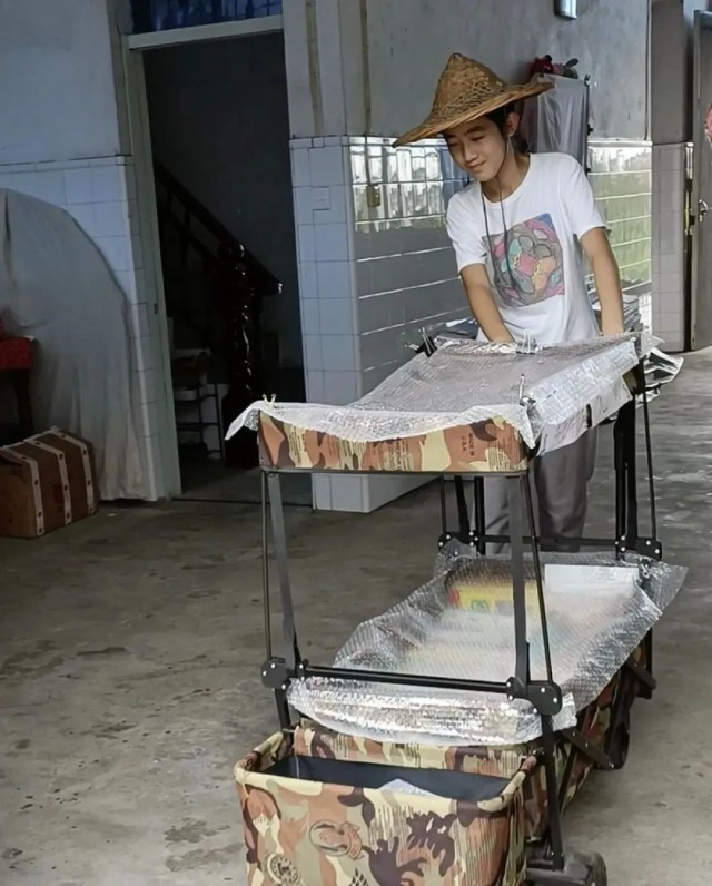 頭上戴著斗笠,臉上掛著靦腆的笑,推著裝滿課外書的迷彩小推車,趕往外婆家附近的集市擺攤。最近,14歲少年王子悅開辦“流動圖書館”的視頻感動了很多網(wǎng)友。