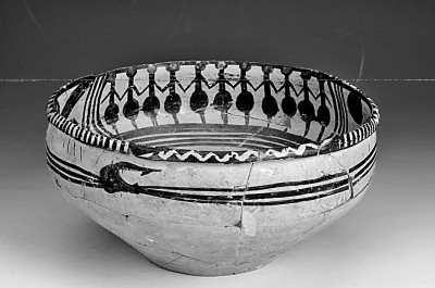 舞蹈紋彩陶盆,馬家窯文化,1995年7月青海省同德縣宗日遺址157號(hào)墓出土。圖片選自《國(guó)寶中的黃河文明》
