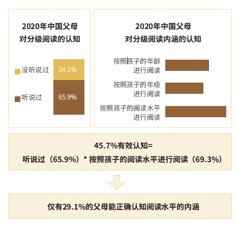 雖然分級(jí)閱讀已經(jīng)成為國際公認(rèn)的閱讀趨勢,可是,從當(dāng)當(dāng)聯(lián)合艾瑞發(fā)布的《2020年中國K12階段學(xué)生“分級(jí)閱讀”白皮書》(以下簡稱《白皮書》)中,我們發(fā)現(xiàn)中國大部分父母對(duì)于分級(jí)閱讀尚缺乏認(rèn)識(shí),更談不上有足夠的重視。《白皮書》指出,有65.9%的父母聽說過“分級(jí)閱讀”,而其中真正了解“分級(jí)閱讀”的父母只占45.7%。