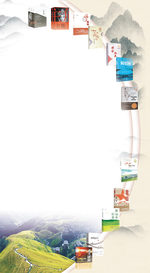 書影圖片從上至下依次為《人世間》《主角》《海邊春秋》《十八洞村的十八個故事》《國家溫度》《琵琶圍》《遠去的白馬》《江山如此多嬌》《靠山》《新山鄉(xiāng)巨變》《西海固筆記》《重卡雄風》(按出版時間排序)。何向陽 供圖;底圖為廣西龍勝各族自治縣龍脊梯田景色。韋吉陽 攝(人民視覺)