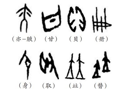 “象形者,畫成其物,隨體詰詘”(《說文·敘》),是根據(jù)客觀物象的形態(tài)輪廓來構(gòu)成文字符號的方法。象形字又稱作“文”,“文者,物象之本”。如“貝”就是一個海貝的象形,也指貨幣;“冊”,就是由竹簡編起來的簡冊的象形;“身”為妊娠的形象,突出腹部。