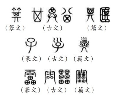 ?。ㄎ澹┧^“9353”,指的是《說文》所收全部正篆,即《說文》分析解釋的全部字?!墩f文》收字以篆文為“正”,作為標準字體,這就是許慎所說的“今敘篆文,合以古籀”的收字原則。“今敘篆文”,就是以篆文(小篆)作為標準正字,同時也會根據(jù)需要收列部分古文和籀文。《說文》所謂“古文”主要是孔子壁中書和民間所獻古文經(jīng)所用的文字,“籀文”即傳為西周晚期太史籀所編字書《史籀篇》上的文字。從《說文》來看,收入的古文、籀文,主要是與篆文有明顯差異的字形。如篆文“箕”“子”“雷”下所收列的古文、籀文: