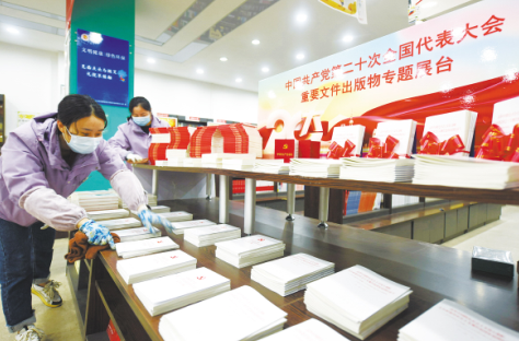 連日來,江蘇省連云港市東海縣新華書店精心設(shè)置了黨的二十大重要文件出版物專題展臺(tái),集中展示展銷黨的二十大文件及學(xué)習(xí)輔導(dǎo)讀物,同時(shí)增設(shè)閱讀區(qū),市民可以隨時(shí)閱讀黨的二十大報(bào)告單行本、《黨的二十大報(bào)告輔導(dǎo)讀本》、《中國共產(chǎn)黨章程》單行本等圖書,吸引了眾多黨員、學(xué)生、市民和機(jī)關(guān)企事業(yè)單位人員等不同群體的讀者前來閱讀選購。