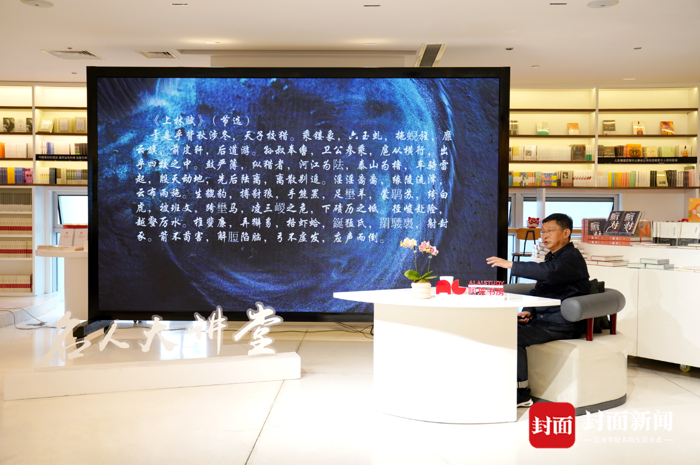 作為資深作家,阿來(lái)在講述司馬相如其人以及他所處的時(shí)代特點(diǎn)、文史知識(shí)同時(shí),還重點(diǎn)從文學(xué)的角度,講解了相關(guān)文史記載文章,還特別以《子虛賦》《上林賦》等司馬相如的作品為例,逐字逐句進(jìn)行分析“賦”這個(gè)文體的優(yōu)、缺點(diǎn)。比如在《上林賦》中,司馬相如寫楚國(guó)之子虛先生出使齊國(guó),子虛向?yàn)跤邢壬v述隨齊王出獵,齊王問(wèn)及楚國(guó),子虛極力鋪排楚國(guó)之廣大豐饒,以至云夢(mèng)不過(guò)是其后花園之小小一角。烏有不服,便以齊國(guó)之大海名山、異方殊類,傲視子虛。