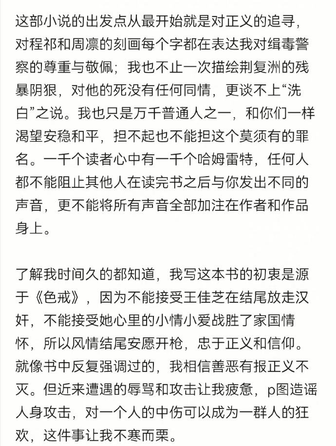 在去年10月14日,疑似《風(fēng)情不搖晃》的作者在其未經(jīng)認(rèn)證的社交媒體賬號(hào)上表示,“小說的出發(fā)點(diǎn)是對(duì)正義的追尋”。在發(fā)布這條內(nèi)容后,其賬號(hào)再未更新,該條微博也關(guān)閉了評(píng)論。