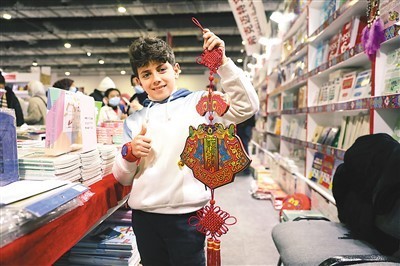 2022年開羅國際書展上,一個男孩在中國圖書展位展示春節(jié)裝飾。