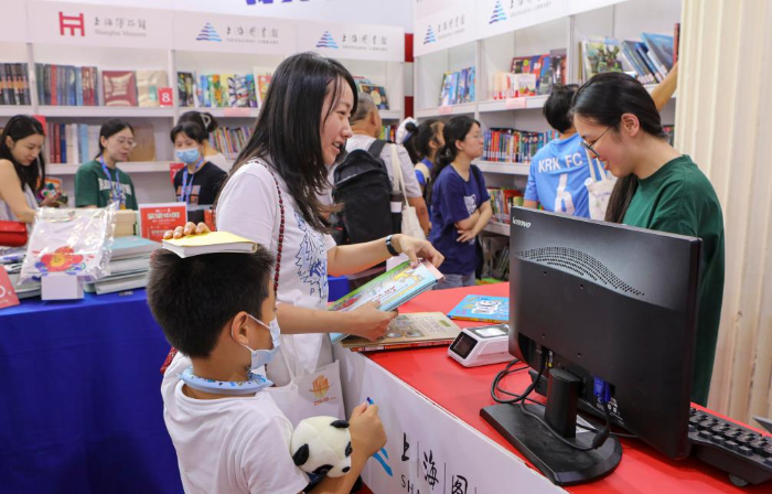 8月16日,讀者在上海圖書館展位現(xiàn)場借閱書籍。