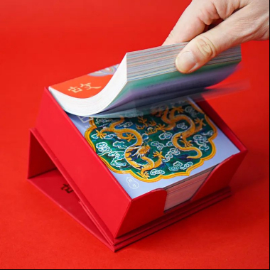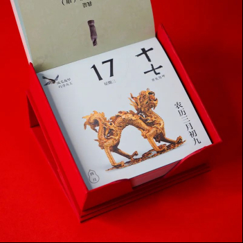 如意取出第一層里紅紅的燙金書刊盒,馬上發(fā)現(xiàn)了它的小機(jī)關(guān):原來(lái)盒蓋上有個(gè)吸鐵石,把它翻過(guò)來(lái),就可以25度傾斜地放在書桌上,舒服地翻閱一整年的“日子”;每一天的頁(yè)面都能被絲滑地撕下,作為小書簽,插在課本讀物中。